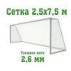 Стандартная футбольная сетка для ворот размером 750х250х100х200 см с толщиной нити 2,6 мм и ячейкой 10 см, предназначенная для тренировок и матчей.